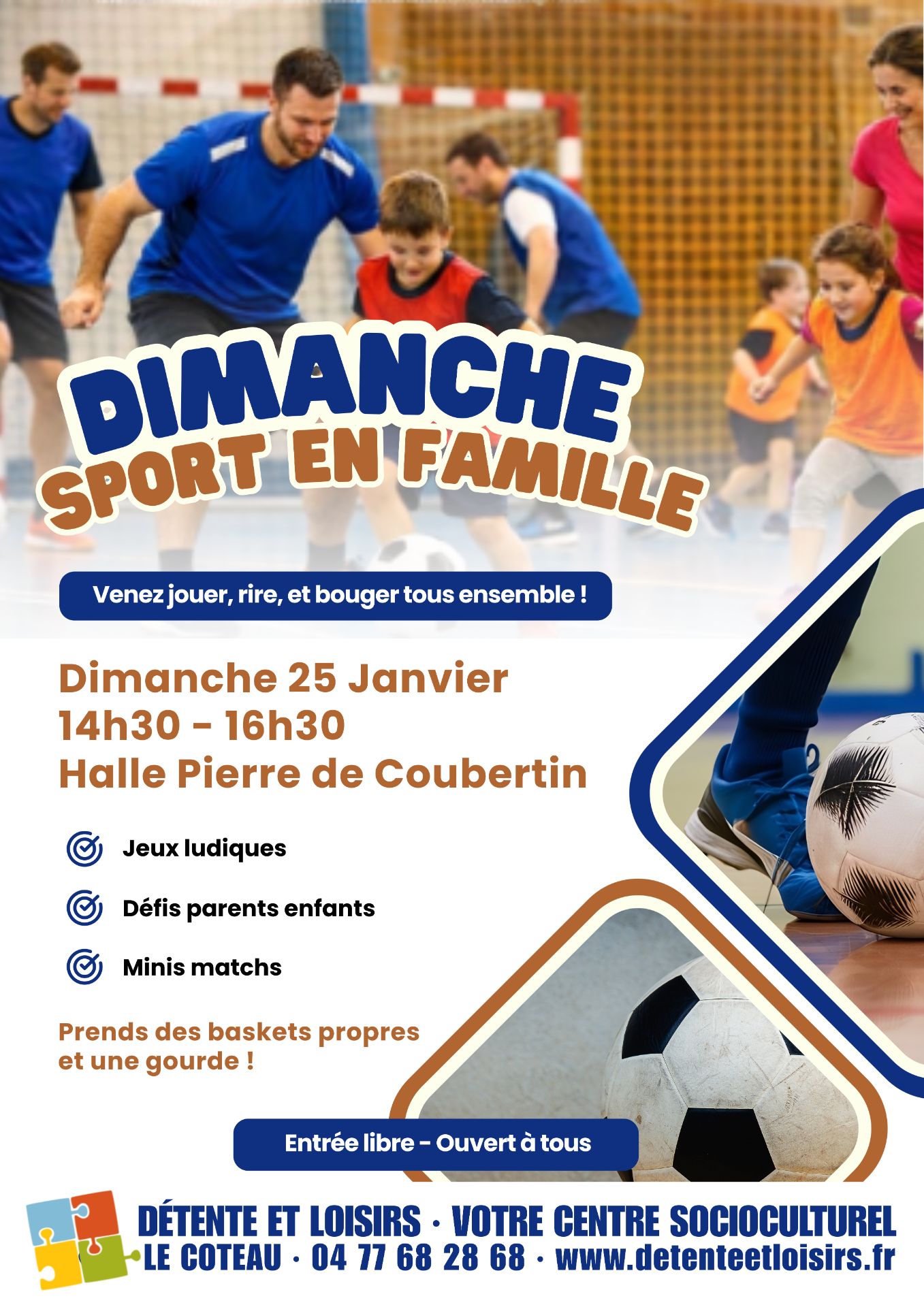 Ces journées sont ouvertes à toutes les familles, petits et grands, dans une ambiance chaleureuse où le plaisir de bouger prime sur la performance. Chaque mois, une discipline différente est proposée afin de varier les découvertes et de satisfaire tous les goûts.